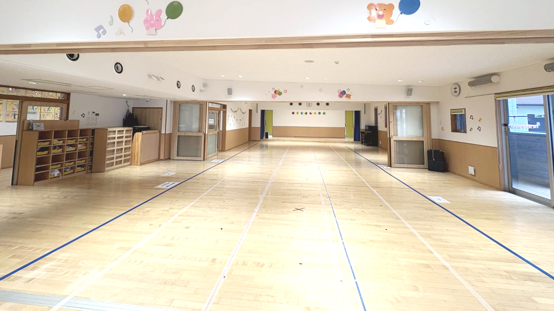 2階の保育室の仕切りを開放すると、大きなホールになります。クラスを飛び越え、園全体で楽しい瞬間を共有しながら、子どもたちの成長を見守ります。