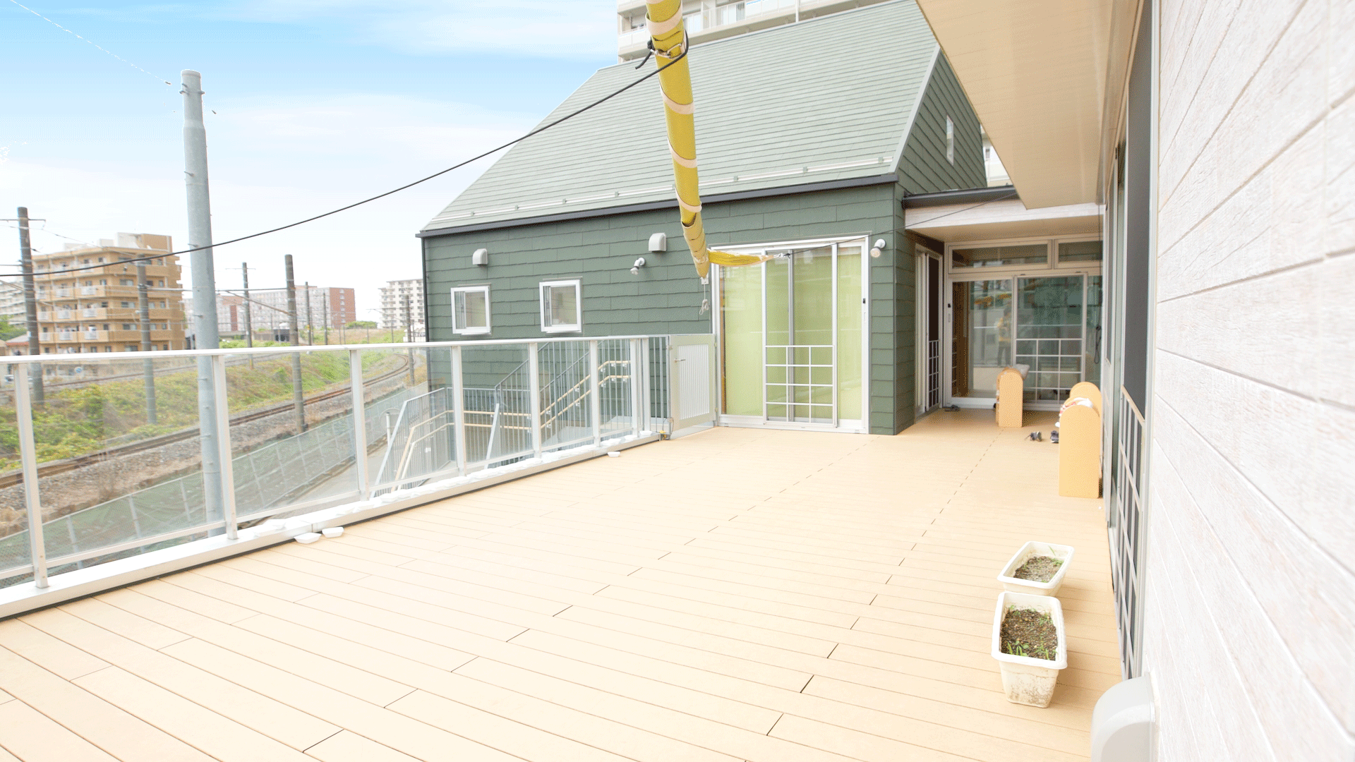 2階のテラスでは、澄んだ青空の下で遊ぶことができる場所です。シャボン玉や水遊びをしたり、園舎の向かい側を走る電車を眺めたり、遊びや好奇心の幅を広げる場所として活用しています。